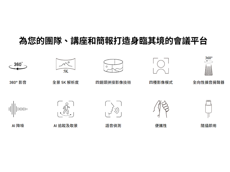 結合影像和音效 All in One 的會議設備,採用 4 顆鏡頭呈現 360° 無縫拼接影像、全向性擴音揚聲器,並透過 4 顆具備 AI 降噪功能的波束成形技術麥克風來捕捉語音。